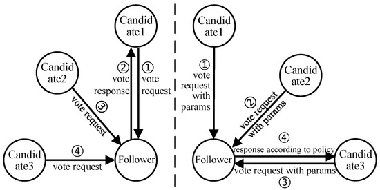 There are four election policies. Candidates send voting requests to other servers with all parameters required by election policies (Figure 2 right part). Like opposition policies, followers can also choose appropriate election policies based on different concerns.