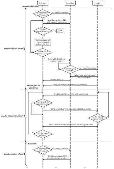 Figure 3 shows the Leader election and opposition process of the Raft-PLUS algorithm. In the Leader election phase, the Candidate sends RequestVote RPC containing election parameters (including processing capacity, the number of times the leader, and the number of client requests received) to other servers. After receiving the RequestVote RPC message, the Follower will verify the request, add the voting request to the request pool and start the timer. When the timer times out (usually set to one-third to one-half of the election timeout) or the number of voting requests in the request pool exceeds one-third of the number of clusters, the Follower will sort the requests according to the preset election policy and send the vote to the highest-ranked Candidate. If the Candidate receives a majority of votes, it will successfully transform into a Leader and start processing requests from clients.