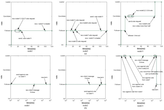 Figure 4 shows the experimental results, and Figure 4a describes the election process. In the beginning, all servers change from the initial state to the Follower state, and then due to timeout, some servers change to the Candidate state. Followers receive RPC from the candidates and send their votes according to the election policy. Finally, node11 receives seven votes (including its vote), gets the majority of the votes of the cluster, and becomes the leader for the current term. Figure 4b describes the process that after receiving more than half of the negative votes, node11 voluntarily gives up the leader status, becomes a follower, and enters a new term. Node1, 4, 10, and 7 send the negative votes due to the leader’s lack of processing capacity. After the client has sent five requests, Node2, 8, and 6 also send negative votes to the leader. In the end, Node11 receives seven negative votes from the followers and actively changes the follower status. The system enters the next term.