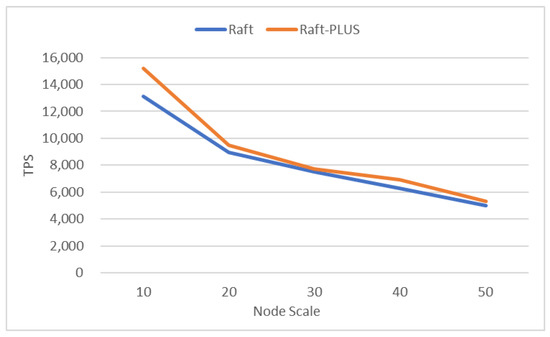 In the performance test, we compared the performance of the Raft and Raft-PLUS algorithms in the normal state and the abnormal state. In the normal state, the performance of the two algorithms under different numbers of nodes is shown in Figure 5. The experimental results show that in the TPS (Transaction Per Second) performance test at the scale of 10 to 50 nodes, the performance of the Raft-PLUS algorithm is generally the same as that of the original Raft algorithm and there is no additional overhead or performance degradation.