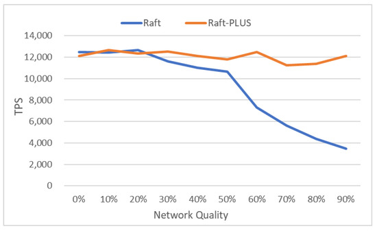 In the abnormal state, we simulate the performance degradation of the Leader node at the scale of 10 nodes and compare the performance of Raft and Raft-PLUS algorithms. The experimental results are shown in Figure 6. As the network quality decreases (the test range of network quality is: the node network bandwidth range is 40–400 kbps, the delay range is 0–50 ms, and the packet loss rate range is 0–10%), the TPS of Raft is also declining, significantly when the packet loss rate exceeds 5% (the network quality is 50%), the system performance drops rapidly, and the Raft-PLUS algorithm maintains a stable TPS because it can actively switch the leader in time. As a result, Raft-PLUS has an average write throughput 40% higher than Raft.