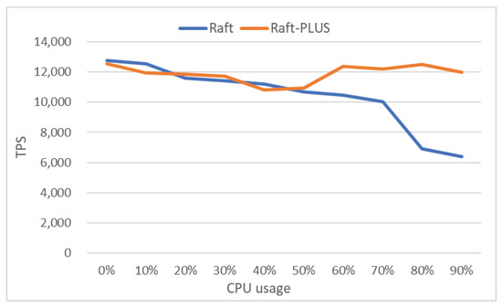 When the CPU usage increases, as shown in Figure 7, the TPS of the Raft algorithm keeps decreasing, especially when the CPU usage reaches more than 80%, the system performance will drop rapidly. At this time, the best solution is to trigger the Leader node replacement actively. Turn the current Leader node into a Follower node, and elect a new Leader. When another node becomes the Leader, the state of the previous Leader node will no longer affect the performance of the cluster. If the node continues to be the cluster leader, it will significantly reduce the performance of the entire system. Therefore, the Raft-PLUS algorithm switches the Leader node when the CPU usage reaches more than 60%, which ensures the system’s performance. As a result, Raft-PLUS has an average write throughput 38% higher than Raft.