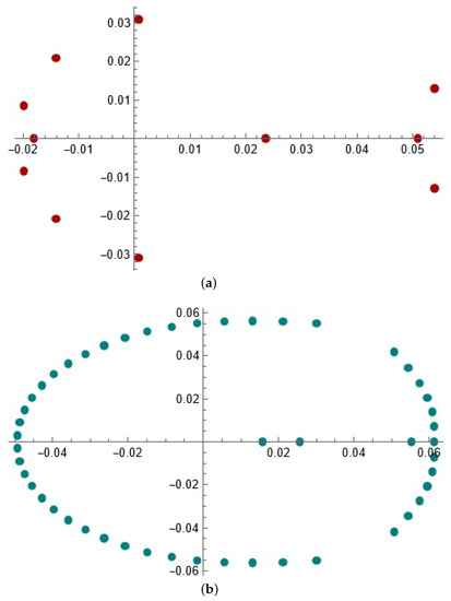 With respect to the study of zeros of the nth Lagrange-based hypergeometric Bernoulli polynomial when are fixed, relatively little is known. For instance, it is possible to use the Hurwitz theorem (see (Chapter I, p. 22)) in [4] for obtaining the fact that the complex zeros of must move further away from the origin as n proceeds to infinity, because the functions to which they converge only have real zeros. In Figure 1, the plots for the zeros of and are shown for prescribed values of m and .