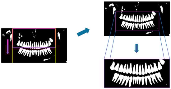 To accurately extract the key areas of the tooth image in a small sample, this study designs a simple and reliable method that relies on two indicators: (1) the proportion of white pixels, and (2) the deviation of the longitudinal center from the longitudinal center of the sub-frame. The calculation formula for the proportion of white pixels is Nwhite/Ntotal, where Nwhite is the number of white pixels and Ntotal is the total number of pixels in the image frame. The calculation formula for the deviation value εoffset between the longitudinal center and the longitudinal center of the sub-frame is as follows: