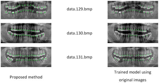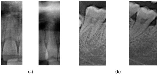 At a large scale, the overall arrangement and brightness of dental X-ray images from different patients vary significantly. The difference at the micro level is manifested in local characteristics. The reason for this may be because of subtle variations in the shape of the teeth of different patients. For example, the central teeth shown on the left of Figure 4a are larger than the ones at the right; i.e., the edges and corners are more obvious, the overall teeth are straighter, and the imaging effect is also different, which is reflected in the brightness and sharpness. The tooth difference in Figure 4b is more evident. Similarly, image transformation methods based on manual processing (through, for example, rotation, translation, elastic deformation, and mirroring) can simulate new samples that are different from the original image; thus, using these methods can increase the effectiveness of the model.