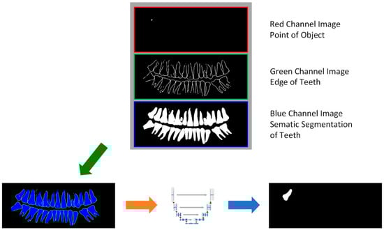 The addition of relative position information can add the positional information of the teeth to the input image; however, this mechanism will cause the network to rely too much on the position itself for the assessment of the object category, and ignore the shape information of the teeth. To solve this problem, this method embeds the grayscale image of a single dental object into the semantic image (shown in Figure 8b), and combines the embedded grayscale, the semantic segmentation, and the object edge images through the channel stitching method, to synthesize a new multiple-channel image named the “teeth structure semantic information fusion map”. The new image not only retains the image features of the dental object, but also provides relative position information for the model; thus, the classification ability of the model is remarkably improved compared to the original image classification. A generated tooth structure semantic information fusion image is shown in Figure 8.