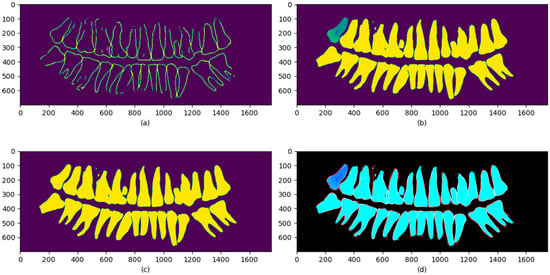 In Figure 8, Figure 8a is the tooth edge image, Figure 8b is the tooth grayscale image embedded in a semantic segmentation image, Figure 8c is the semantic segmentation teeth image, and Figure 8d is the image spliced by Figure 8a–c; Figure 8a is in the red channel of the RGB image, Figure 8b is in the green channel, and Figure 8c is in the blue channel. The algorithm for image generation is presented in Algorithm 3. Each pixel needs to be accessed in Algorithm 3, so the time complexity is O (mn), and m and n represent the length and width of the image.