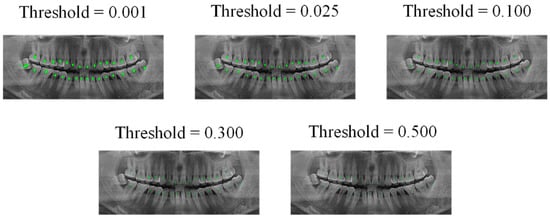 Figure 10 indicates that if the image output is according to the default output threshold (0.5) of conventional semantic segmentation, the central point image cannot effectively express all object centers of the teeth. However, if the output threshold is set to very low levels, we often encountered adhesion of the object centers of the teeth; based on experience, we set the threshold of the central point output to 0.025, so that all centers can be expressed as much as possible, and they are also well separated.