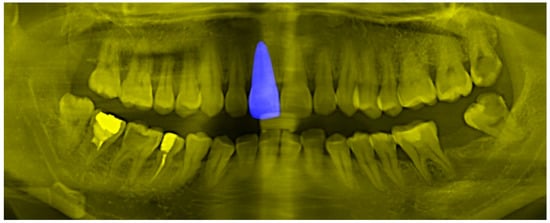 As mentioned in 3.3, high image information entropy will interfere with the DNN model, making the model learn many non-robust features. In 3.4, this paper implements a multi-channel tooth semantic structure information map, because in the image, most of the pixel values are binarized, so the information entropy of the image is low. In order to prove the advantages of the low information entropy image, this paper designs a tooth semantic structure map with high information entropy as the ablation experimental sample. The high information entropy also provides the DNN classification model with the global information of the teeth, the position information of the teeth and the shape information of the teeth. The specific construction method is relatively simple. The segmented image of the object instance of the tooth is inserted into the blue channel of the original tooth grayscale image, as shown in Figure 13. Theoretically, the image contains all the features in the tooth semantic structure information map proposed in 3.4, but the information entropy is higher than in the tooth semantic structure information map.