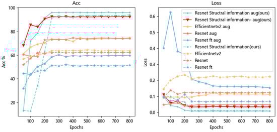 In order to demonstrate the improvement of the classification ability of the semantic structure information map, Resnet18 was used to classify the tooth semantic structure information map. The efficientnetv2, Resnet18, and Resnet18 networks based on ImageNet pre-training (ft stands for pre-training fine-tuning) were used to classify dataset 3. In terms of hyperparameter settings, the initial learning rate of these models was 0.01, and then every 200 epochs were multiplied by 0.1; the number of epochs was 800, and the batch-size was 20. The results of the test set were as in Figure 14.