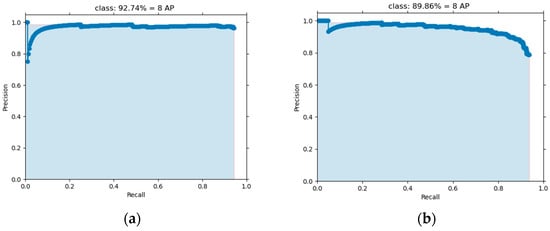 Comparison of precision–recall curves of the category with the lowest AP of the proposed method (a) and category with the highest AP of the Faster R-CNN (b).