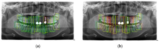 As shown in Table 4, the object detection ability of SPSC-NET in the case of few-shot was significantly improved compared to Faster-RCNN. The reason for this phenomenon is that SPSC-NET uses images of tooth semantic structure information. The object detection ability of the model in the training process was significantly enhanced, and the SPSC-NET was more powerful in the object classification, due to the use of the tooth object classification method based on the fusion semantic image. Based on the above reasons, the object detection ability of SPSC-NET was better than that of Faster-RCNN. At the same time, we also found that, although the AP value of Faster-RCNN is better when the box score is very low, the performance of its mIOU is even worse. The actual performance of the two is shown in Figure 16: Figure 16a is the output of the SPSC-NET method, and Figure 16b is the output of the Faster-RCNN when the box score is 0.3. Red is the wrong ROI, and green is the correct ROI. From the detection in the figure, although the AP value of Faster-RCNN-based tooth object detection reached 73.56, due to the defects of the AP value, as the number of frames increased, the performance decline did not affect the AP value when the recall value unchanged, and the decrease in the accuracy rate did not affect the AP score, so the actual performance of Faster-RCNN was much worse than the performance on the AP data indicator. According to the results of the work of Laishram et al. [], the Faster-RCNN performance was higher after training with 96 images. This proves that with the same model, the increase in the training image improves the model performance of Faster-RCNN. It is also worth noting that in our comparison, the single-stage object detector based on transfer learning was not of practical value for the performance, which is consistent with the review results of Singh et al. []. In addition, the TFA method in the field of small-sample object detection did not perform well in our tests, which can confirm why there is little research in the field of dental detection using the FSOD method; the reason for this phenomenon is because TFA relies on the base dataset, and using the generic dataset as the base dataset will cause the source domain to mismatch the target domain. Unlike Faster-RCNN, if the researchers want to apply the FSOD method to the field of tooth target detection, they need to conduct more in-depth research on the FSOD models and the feature of tooth detection data.