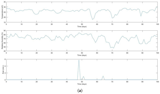 Temperature (T), relative humidity (D), and rain (R) were the three types of environmental data used in this study. We obtained all of our data from the PRRC. There were four beds. For bed 1, the mean temperature, relative humidity, and rain were 27.23 °C, 81.84%, and 6.53 mm, respectively. The temperature was between 24.2–34.65 °C. The relative humidity was between 68–91.5%. In addition, the maximum rain was 71 mm, and the minimum rain was 0 mm. The data are shown in Figure 2a. In bed 2, the mean temperature was 26.98 °C, and a temperature range was seen of 24.15–29.8 °C. The average relative humidity was 81.06%, while the relative humidity ranged from 69.5 to 91.5%. The average rainfall was 4.57 mm, with a high of 46.1 mm and a low of 0 mm. Figure 2b represents the results. The mean temperature in bed 3 was 26.02 °C, while the mean relative humidity and rain were 71.52% and 0.08 mm, respectively. The temperature was between 17.7 and 29.2 °C. The relative humidity ranged from 47 to 84.5%. In addition, the greatest rain was 5.8 mm, and the minimum was 0 mm. Figure 3a illustrates the data. In the last bed, the average temperature was 26.63 °C, with 17.7 to 30.25 °C. The mean relative humidity was 71%, while the relative humidity ranged from 47 to 84.5%. The mean rainfall was 0.16 mm, with a maximum of 9.6 mm and a minimum of 0 mm, as shown in Figure 3b.