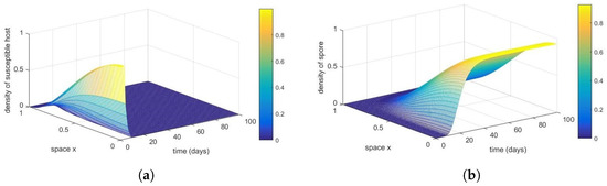 Moreover, we assumed that at each time t, only one drop of rain fell on the host with the same velocity. The results of simulations are shown in Figure 4. For bed 1, the density of the healthy host, H, and the density of spore dispersal, u, are shown in Figure 4a,b, respectively. Figure 4c,d, Figure 4e,f, and Figure 4g,h represented bed 2, bed 3, and bed 4, respectively. The x-axis represents time t, which ranges from 0 to 100 days, and the y-axis represents space x. We considered one unit, and the z-axis represents the densities of healthy and spore.