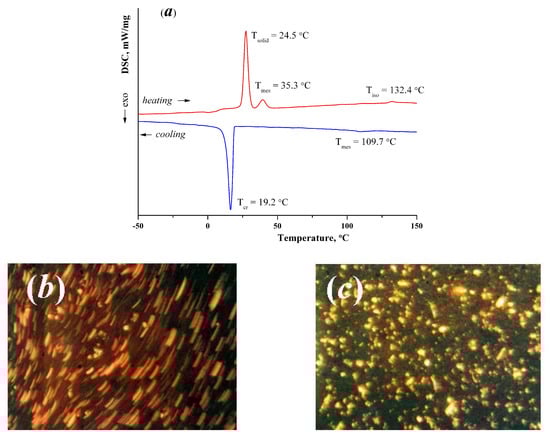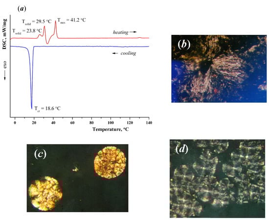 According to the DSC method, a solid-state transition (Tsolid = 23.8–29.5 °C, ΔH = 113.71 kJ/mol) was recorded in the heating cycle followed by crystallization in the temperature range 32–37 °C (ΔH = −68.71 kJ/mol) for sample 5 (Figure 3a). The subsequent endothermic transition at T = 41.2–45.5 °C (ΔH = 115.23 kJ/mol) indicates the formation of mesophase spherulites which is confirmed by POM (Figure 3b). With further heating in the field of view of the microscope the mesophase texture transforms into an anisotropic field at temperatures above 130 °C (Figure 3c).