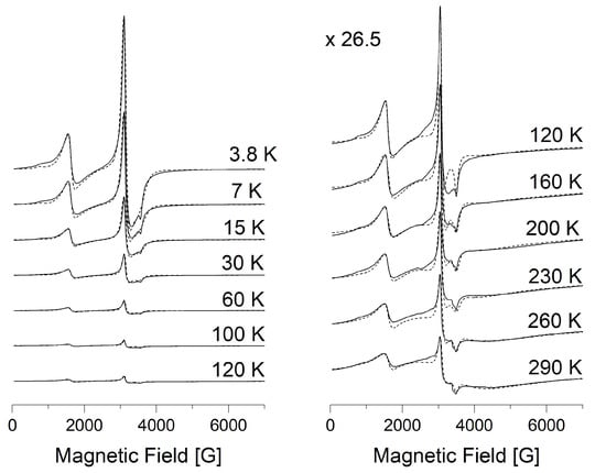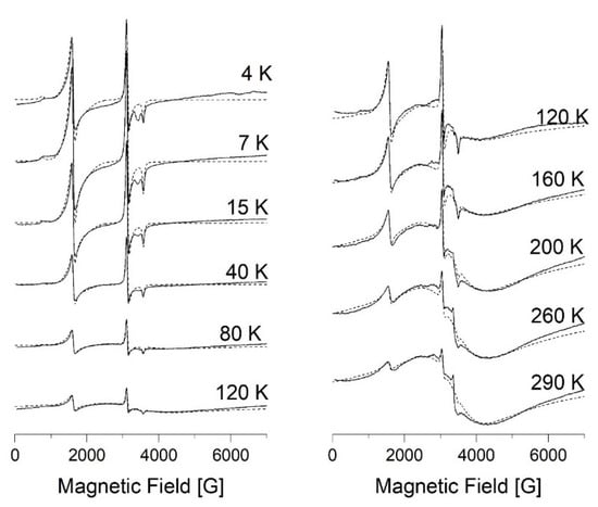 X-band EPR spectra of compound 1 in the temperature range 3.8–120 K and 120–290 K. The dashed line is the result of modeling by EasySpin Matlab.