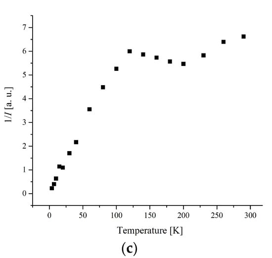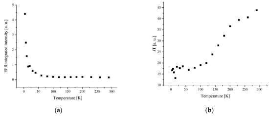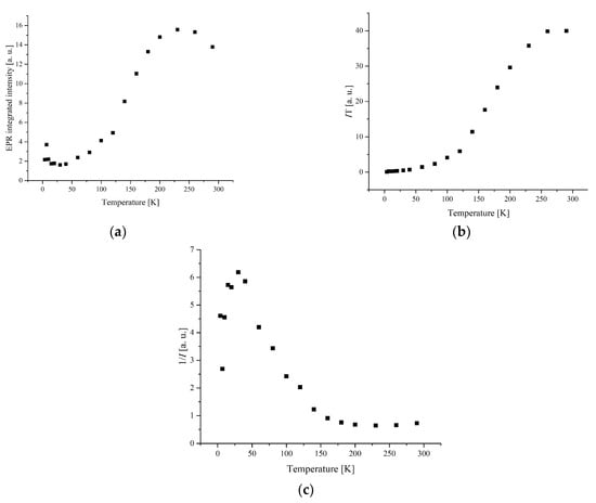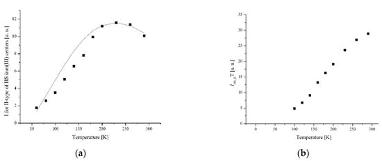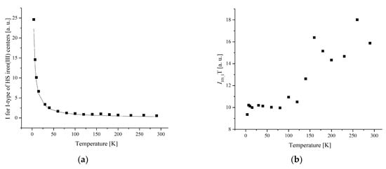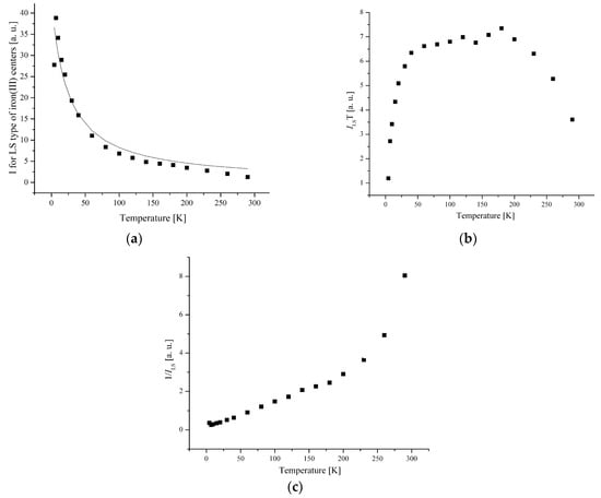 The temperature dependence of the EPR lines integrated intensity (I) is one of the sources of information about the spin transition. The magnetic behavior presented by the temperature dependence of I, I × T, and 1/T is shown in Figure 6 and Figure 7.