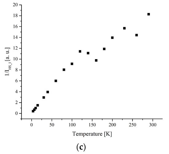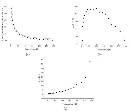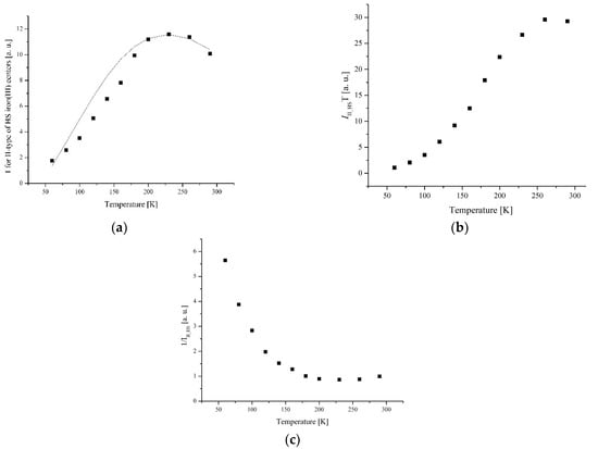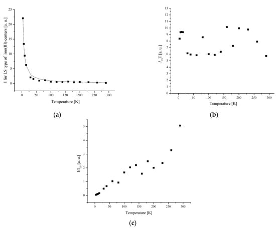 (a) The temperature dependences of the EPR lines integrated intensities; (b) IT; (c) 1/I of II-type HS Fe(III) centers for complex 1.