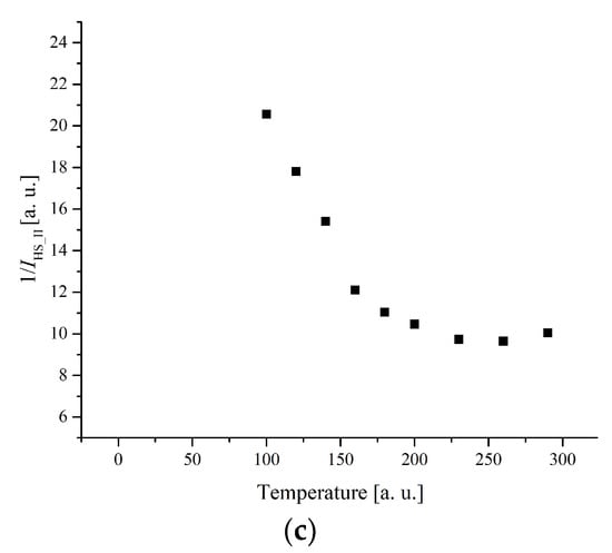 (a) The temperature dependences of the EPR lines integrated intensities; (b) IT; (c) 1/I (c) of II-type HS Fe(III) centers for complex 5.
