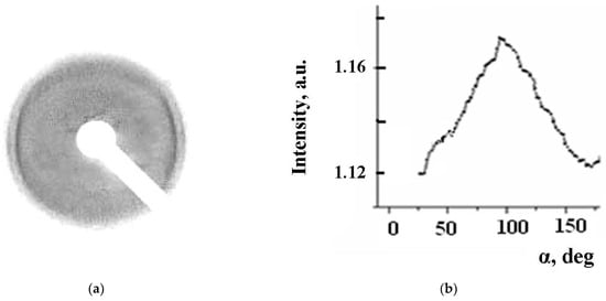 A biaxial LB film can be obtained from oriented monolayers, provided that their orientation is preserved when transferred to the substrate. The presence of orientation can be determined by the texture electron-diffraction pattern, if it is obtained with a normal incidence of the electron beam on the plane of the film. In the electron diffraction study of LB films assembled from monolayers oriented by a magnetic field, in the case of complex 5, it was possible to obtain a texture electron diffraction pattern showing the presence of a planar orientation in the film, see Figure 16. At the same time, the electron diffraction pattern of the films of complex 2 contains ring diffraction maxima, which indicate the absence of orientation.