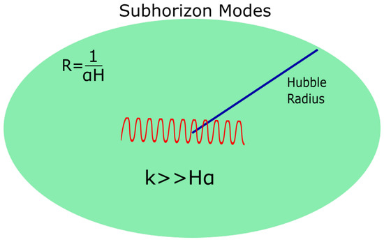 The procedure to extract the overall effect of the gravity on the primordial gravitational waves is based on a WKB method which applies on the modes that became subhorizon just after the inflationary era ended, so during the reheating era. For a pictorial representation of the subhorizon modes, see Figure 1. The WKB method was developed in Refs. [29,30] and relies on the calculation of the parameter , defined as