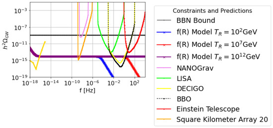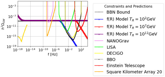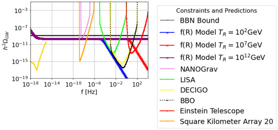- Nishizawa, A.; Motohashi, H. Constraint on reheating after f(R) inflation from gravitational waves. Phys. Rev. D 2014, 89, 063541. [Google Scholar] [CrossRef]