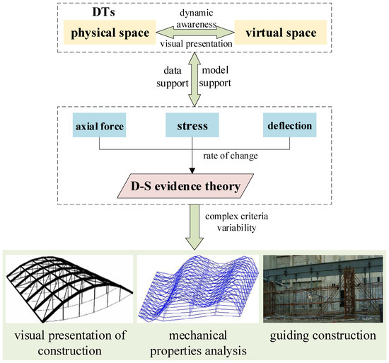 - In order to accurately obtain the key stress components of the structure, the safety performance of the structure is analyzed by considering the multiple mechanical parameters extracted from the twin model driven by the D–S evidence theory. The application of the D–S evidence theory can help to effectively avoid the problem of the insufficient accuracy of key components evaluated by a single index.
