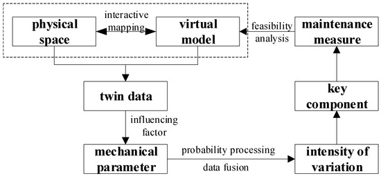 Driven by the DTs frame, the D–S evidence theory can be integrated to capture the most critical component units in the structure, and finally, the intelligent analysis of structural construction safety is realized. Firstly, twin modeling of the real construction structure is carried out to realize the real mapping of the real construction process. In the virtual model with high fidelity, the working conditions corresponding to the construction site are established to extract the mechanical performance index data of the model simulation. The relevant information of the index data is processed by probability, and the mechanical properties of each component element in the structural system are calculated using the D–S evidence theory algorithm. According to the degree of change analyzed by comprehensive mechanical parameters, the key stress components are captured, and then the maintenance measures of construction unsafe events are formed [35]. The maintenance measures are analyzed in the virtual model to guide the construction of physical space. In this study, the mechanical properties of each component element are characterized by a variation in the mechanical parameters. By sorting the change probability of mechanical parameters of each component element of the structure, the change degree of mechanical properties for each component element can be determined. The variation degree of multiple mechanical parameters can be used to visually determine the most critical component unit of the structure, so as to provide the basis for the safety performance evaluation and maintenance of the structure. Using the analysis of the change degree of mechanical parameters, the process of safety performance evaluation and the maintenance of the structure are represented in Figure 3.