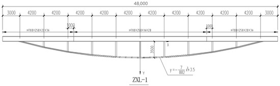 Taking a string-supported beam roof as the research object, one of the plane string structures was selected for the calculation model. The model construction is shown in Figure 4. The span of the structure is L = 48 m, the rise height is 0 m, the sag is 3.5 m, and the number of struts is nine. The upper chord beam adopts H-shaped steel, Q345B. The pole adopts a round steel tube, Q235B. The lower chord cable adopts two types of 55 light circle stress-relief steel wires. The section size is shown in Table 3.
