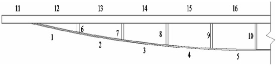 The structure of this study is symmetrical. Therefore, in the process of conducting a construction safety analysis, half of the structure was utilized to judge the change in the mechanical parameters of each component. In the process of analysis, the components of the half structure were numbered as shown in Figure 5. The twin model of the structure was built in MIDAS. In this study, the cable and brace members were the main objects of analysis. In the finite element model, the strut and cable members were set as truss elements. Therefore, the cable unit is the tension only unit. The constraints of the cable and brace are articulated points. The finite element model can reflect the performance of the structure effectively. In the analysis process, the temperature effect is the influencing factor of structural safety performance. Driven by the integration of DTs and the D–S evidence theory, the changes in stress, deflection and axial force of each component were analyzed. Three kinds of mechanical parameters were integrated to judge the key components of the structure, and strain gauges were arranged on each component in the construction process to collect changes in real time. According to the collection results, the key stress components were found. Finally, the key components obtained by the two methods were compared to verify the effectiveness of the method. In this test structure, the change in the mechanical parameters of the upper chord beam was relatively small. In the analysis process, the change in the mechanical parameters of struts and lower chord cables (i.e., number 1–10) was analyzed carefully.