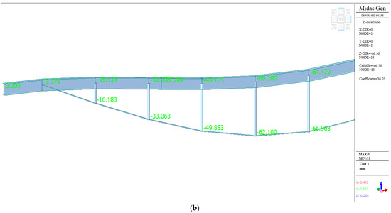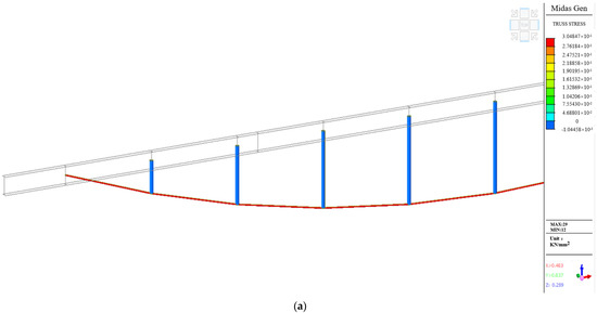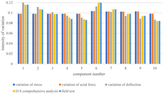 In the Equation, denotes the probability correction coefficient, . The calculated probability can be used for the fusion analysis of D–S evidence theory, so as to determine the comprehensive changes in the mechanical parameters of each component. Similarly, the change probability of mechanical parameters of each component can be obtained using the axial force and deflection as the discriminant indexes. Combined with the D–S evidence theory, the response of the structure to temperature can be obtained by comprehensively judging the change in the mechanical parameters of each component. At the same time, the change rate of strain data measured by strain gauges in real structures can be used as the basis to verify the effectiveness of this research method. When the temperature rises by 50 °C, the structural mechanical parameters in the twin model are shown in Figure 7.