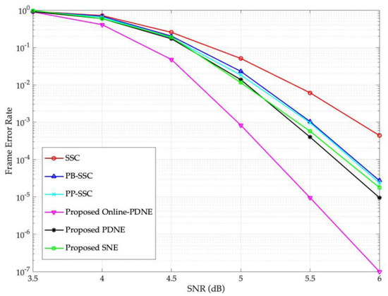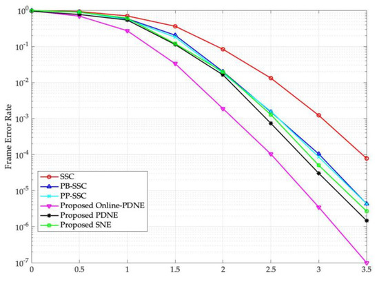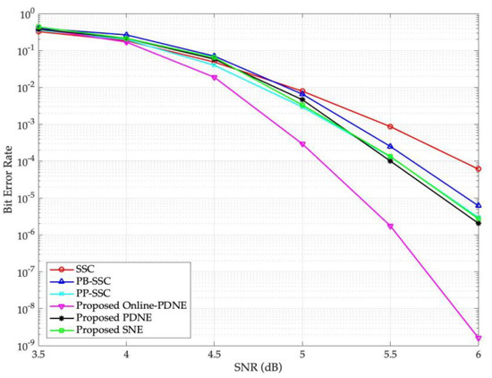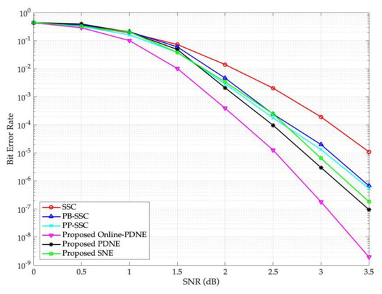 - Different from the optimization of the set for each SNR value in [36], the proposed PDNE decoding algorithm in this paper only needs to optimize one set , which greatly shortens the optimization process and reduces the spaces for storing the noises from the perspective of implementation. This indicates the algorithm in the paper has better generality.