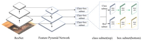 The RetinaNet model is a single-stage model, commonly used in computer vision today, which has a simple structure and fast recognition [10]. As shown in Figure 1, the model consists of two parts, i.e., a backbone network and two prediction branch networks. It works as follows: after receiving the input image, RetinaNet divides the image into a grid of different sizes, and first extracts features from this image through the backbone network ResNet, and then builds the FPN layer on top of the ResNet network structure, i.e., the three depth feature layers extracted in ResNet are fused with the FPN layer, after which each fused feature layer is predicted individually. The last two prediction branch networks are divided into two parts, classification and box regression, with the class sub-network performing target classification on the output of the backbone network, and the box regression sub-network performing target bounding box regression, with the parameters shared between the different layers of the whole structure, but not between the classification and regression branches.