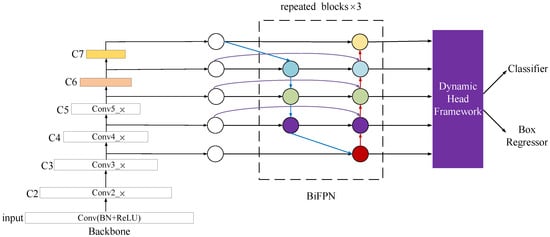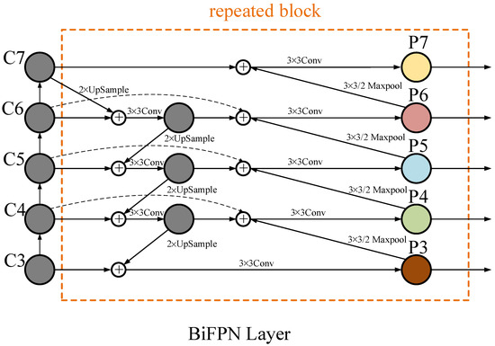 In this study, DY-RetinaNet enables the model to perform multi-scale fusion simply and efficiently by introducing BiFPN as a replacement for the FPN layer in the initial model RetinaNet. Since the model affects the final fusion layer of output features differently when the input features are fused at different resolutions, feature fusion can be performed adaptively at this time by introducing learnable weights, such that an efficient feature fusion structure is constructed, i.e., a weighted bi-directional feature pyramid network (BiFPN) [14]. The structure of BiFPN is shown in Figure 3. It applies the idea of bi-directional fusion by repeatedly applying top-down and bottom-up bi-directional channels, and adds double lateral connections between features at the same level to enable the network to perform efficient multi-scale feature fusion. At the same time, corresponding weights are assigned to the importance of different input features, and the feature information at different scales is balanced by the weights. After the superposition of multiple BiFPN structures, the final output features fuse the semantic features at high and low levels.