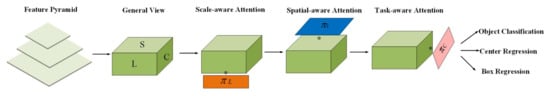 - Scale-aware attention: this module is used in the dimensional level to recognize objects of different scales. Different levels of feature map correspond to different target scales; increasing attention at a given level can reveal a variety of semantic information of relative importance to enhance the scale-awareness of feature learning and target detection.