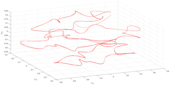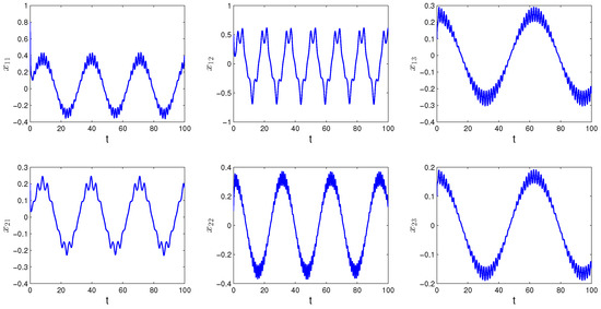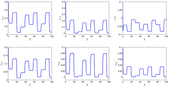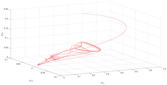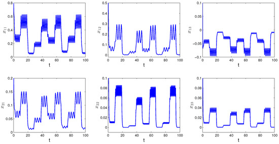 Since the elements of the convergence sequence are multiples of h and the period is equal to the Poisson number , is equal to zero. Furthermore, where The conditions – of Theorem 1 hold for the network (8) with for all As is the case for Theorem 1, Equation (8) admits a unique asymptotically Poisson stable solution In Figure 1, the solution of SICNNs (8) is shown, which asymptotically converges to