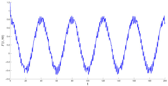 To shed more light for the suggestions and provide several issues for the next observations, let us look not only at the simulations results for the networks in the examples above but simulations for Poisson stable functions, especially driven to compare with the industrial simulations in papers [50,51,52,53,54]. For this reason, let us consider the two-component function where a and b are real coefficients, is the Poisson stable function with step h described in the last section, and the first component is an -periodic function. The parameter is the periodicity degree, which was introduced above in Example 1. It can be very useful for the analysis of time series obtained in different areas—both theoretical and engineering. In Figure 7, Figure 8 and Figure 9, we have the graphs of functions and respectively. The graph of function with the periodicity degree is shown in Figure 7. We obtain the function that admits a clear periodic shape which is enveloped by irregular Poisson stability—which can be said about the dominance of periodicity in this case.
