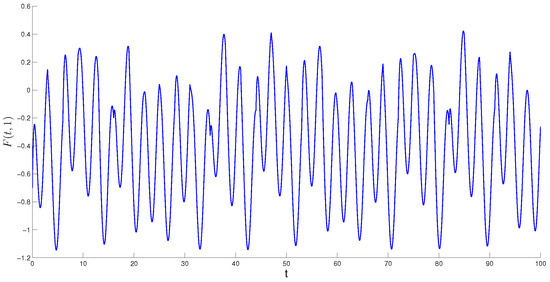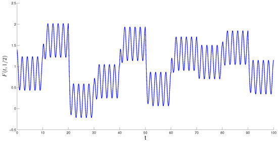 where activation function the coupling strength For each fixed and the coefficients are the same for all such that the cell belongs to The functions are 2-periodic such that Functions and are Poisson stable, The function is the solution of SICNNs (8) obtained for with In Figure 6, the solution of (9) with is depicted. In the model, the periodicity degree is equal to 1 and the periodicity is clearly not observable.