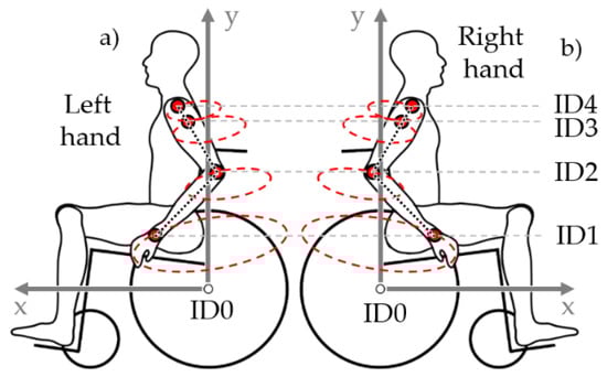 The biomechanics of the wheelchair propulsion process can be broadly divided into two separate cases related to the kinematics of the left and right upper limbs. Such an assumption seems to be justified by the laterality of the right and left sides of the human body. On the other hand, when analysing the process of wheelchair propelling, the symmetry of both sides of the human body is often assumed. This can be explained by the fact that the asymmetry of propulsion and the lack of the coupling of the wheels results in difficulties in riding in a straight line [24]. Moreover, such a simplified assumption is also advantageous during experiments, as it reduces the amount of equipment necessary for recording the biomechanical parameters. Regarding motion capture techniques, it allows, for example, the use of only one camera. This approach effectively reduces the resources and time needed for such research and for the processing of the recorded data. Although there is a justified possibility to apply the assumption of the symmetry of propulsion to some extent, it is not a clear issue. There are a number of studies focusing on differences concerning side-to-side differences in propulsion mechanics. On one hand, some results suggest that there are no significant differences in symmetry in variables associated with the kinematics [25] and kinetics [26] of wheelchair propulsion. It is also often indicated that there are some differences in the arithmetic mean values of the analysed biomechanical parameters, although the values remain statistically insignificant [25,27]. On the other hand, there are also research results showing differences in similar propulsion variables for the left and the right sides of the body [28,29].