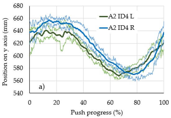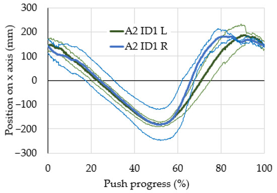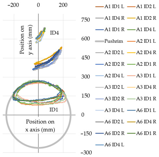 Figure 2 presents a view of the set of averaged results for the right and left hands of the research participants: A1, A2, A3, and A6. Figure 3 and Figure 4 show the mean ID1 and ID4 marker position changes over the course of the propelling cycle for the left and right hands, respectively. The graphs show the displacements on both the x and y axes. The purpose of this was to show which parts of the push progress and displacements on which axes were the greater sources of the position range changes. Figure 5, Figure 6 and Figure 7 show the averaged positions of the ID1, ID2 and ID4 markers in juxtaposition for the left and right sides of the selected research participants. The graphs show the positions of individual markers as the push progress function. This should be understood as the percentage advancement of the propelling phase, where 0% is the beginning of the movement, and 100% is the end of it. Therefore, going from 0% to 100% push progress is equal to one propulsion cycle. The analysis of the presented charts shows that there are some differences between the left and right hands in the averaged curves of displacement on the x and y axes for each of the selected research participants. It was observed that greater side-to-side differences were recorded for the ID4 marker than for the other markers. However, it is particularly important to compare the mutual position of the confidence intervals for the average curves determined. It can be observed that, in most cases, the mean values for the left and right hands are contained in the confidence intervals of the opposite limbs (especially for the ID1 and ID2 markers, located on the hand and elbow, respectively; this applies to a lesser extent to the ID4 marker located on the arm). Nevertheless, there are also such large differences that the average position and confidence intervals of the given markers on the right and left hands do not coincide. It is clearly seen, e.g., in the final part of the chart in Figure 3 and Figure 7. This is due to the differences in the positions of the markers within the curves, based on which the mean values were determined. The conclusion is that the differences observed between the left and right limbs are most likely caused by significant differences in the relative position of the markers (and not the dispersion of their positions) within the individual propelling cycles that comprise the mean curves.