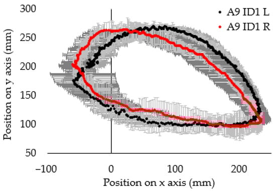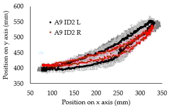 The averaged positions of the ID2 marker for the left and right side of participant A9; the error bars marked in grey are ± measurement uncertainty for the left limb.