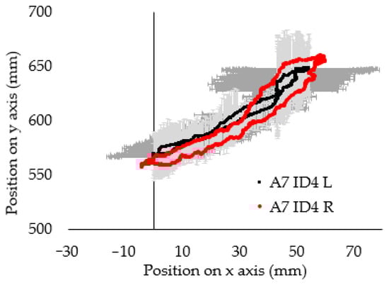 The averaged positions of the ID4 marker for the left and right side of participant A7; the error bars marked in grey are ± measurement uncertainty for the left limb.