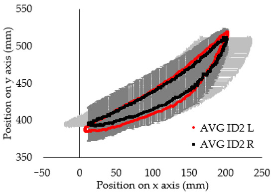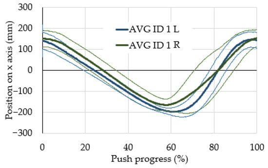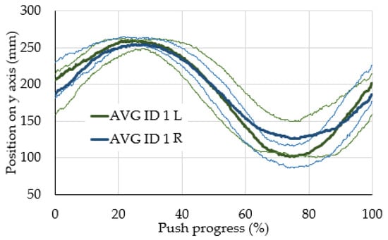 The average curves were determined successively, not accounting for the individual research participants, but only with divisions into the left and right sides of the body (in other words, the positions of markers for all left and right hands were averaged). Figure 8 and Figure 9 present the averaged curves (AVG) of the change in the position of the ID1 marker on the x and y axes during the propelling cycle for all research participants, separately for the right and left limbs. Figure 10 shows the averaged curves (AVG) of the ID2 marker of all research participants for the right and left hands, respectively.