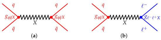 The tree-level production of a hypothetical new particle X, from a pair of quarks, is one possible way in which new physics can be produced at the LHC. The particle X is typically assumed to be unstable, and thus promptly decays back to Standard Model particles. (a) These decay products could be the same as the production mechanism, namely, a pair of quarks, meaning that the search for the new particle X relies on assuming the existence of only a single coupling between the Standard Model and X (). (b) In contrast, the decay could be to some other pair of Standard Model particles, such as leptons, which introduces an assumption on a second coupling between the Standard Model and X ( and ). While these diagrams are shown for a charge-neutral X, they can be adjusted for other types of X, thereby reaching the same conclusion: the hadronic strategy requires fewer assumptions about the couplings between the Standard Model and the new particle.