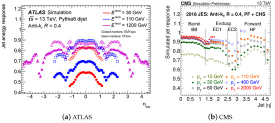 The full jet calibration chain is quite complex, although ATLAS [18] and CMS [15,19] have converged on the motivations behind and procedures for the majority of the corrections within the full calibration chain. The scale is first corrected using simulated samples, adjusting the mean of the reconstruction jet response to match the truth expectation, thereby correcting for the calorimeter response, which varies across the ATLAS and CMS detectors. This truth expectation is defined using truth jets, which are built by applying the anti- jet algorithm with to the set of detector-stable and detector-interacting truth particles generated by a given simulated event generator. The most significant simulation-based correction for ATLAS and CMS is shown in Figure 4; the correction factors are expected to be different as they account for detector-specific effects. The usage of particle flow inputs reduces the magnitude of this correction: the full track momentum is observed, in contrast to sampling calorimeters observing only a fraction of the total deposited energy.
