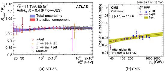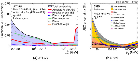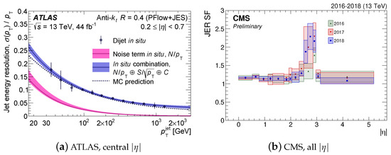 In addition to the scale, it is also important to quantify the jet momentum resolution. ATLAS and CMS agree on a model to define the jet resolution [18,19]: . In this equation, N represents the electronic and pileup noise within the jet, S represents the stochastic nature of hadronic showers in calorimeters, C is a constant term defining the calorimeter’s fundamental limitations, and is the transverse momentum of the jet. This functional form is used in fits to measurements of the jet resolution in order to extract a smooth trend, where the individual measurements are derived following in situ methods, including the balance of jets in events containing exactly two jets. ATLAS also considers the balance of randomly-defined cones as a measure of constraining the noise term, while CMS evaluates the balance of a probe jet against a reference Z boson decaying to . The resulting resolution measurements are shown in Figure 7, where ATLAS and CMS present their results slightly differently, but in the end they see similar trends.