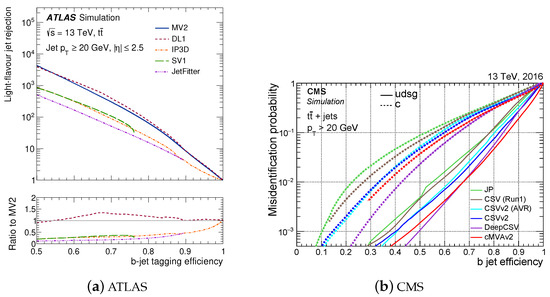 The performance of a variety of flavour-tagging algorithms, quantified in terms of the ability to identify b-jets with a given efficiency, and the corresponding (a) background rejection of light-quark and gluon jets in ATLAS [23] and (b) misidentification probability of light-quark and gluon jets (udsg) or charm jets (c) in CMS [24]. ATLAS shows results as a function of background rejection, while CMS shows results as a function of misidentification probability; these quantities are the inverse of each other.