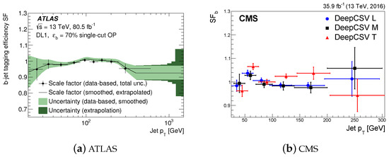 The variety of tagging algorithms developed by ATLAS and CMS are optimised based on comparisons of different simulated samples, and it is possible that the features learned by the machine learning tools are not well-modelled. It is thus of great importance to also study the behaviour of the final taggers in both data and simulation, to extract scale factors associated with any potential differences, and to define an uncertainty on the extent to which simulation matches data. ATLAS and CMS both have multiple methods for extracting such scale factors [23,24]; representative scale factors for b-tagging using deep learning classifiers are shown in Figure 10. While the scale factors do differ from unity, indicating that simulation does not perfectly model the data, such deviations are generally quite small and thus the tagger performance is reasonably well modelled.