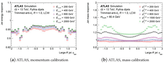 The procedure for both momentum and mass calibrations starts by comparing a given reconstructed jet against its truth jet reference, but in this context the truth jet must also have the same grooming algorithm applied to remove underlying event contributions in the same way and thus represent the same type of shower in the detector. The corrections are derived sequentially, as the momentum calibration scales the full four-vector (including the mass), and the mass is then further corrected [29]. The resulting momentum and mass calibrations, correcting for the ATLAS detector response, are provided in Figure 13. In order to properly correct the response, the mass calibration is actually dependent on the jet mass; a plot corresponding to the correction for a jet with the W boson mass is shown.