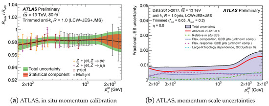 - ATLAS Collaboration. In situ calibration of large-radius jet energy and mass in 13 TeV proton–proton collisions with the ATLAS detector. Eur. Phys. J. C 2019, 79, 135. [Google Scholar] [CrossRef] [Green Version]